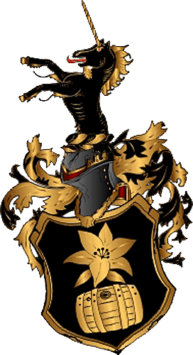 Auf gold berändertem Schwarz unten ein liegendes, goldenes Faß. Darüber eine offene natürliche Lilienblüte, golden.