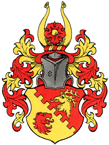 Schild: Schräge Zinnenteilung von Rot und Gold; zugewendet über einem roten Löwenkopf ein goldener Hirschkopf.